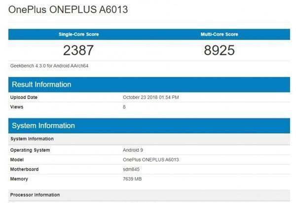 一加6T搭载了高通骁龙845芯片,配备了8GB的运行内存,并预装了Android 9 Pie系统。其详细配置及跑分成绩如下: