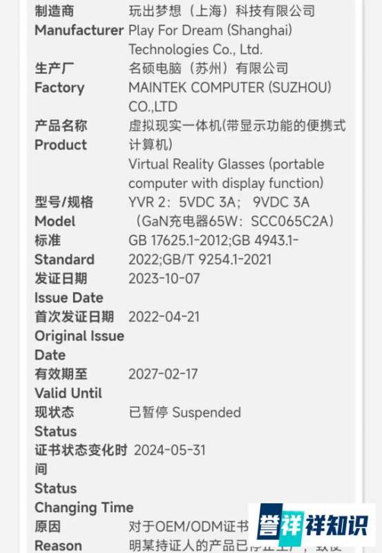 YVR2停产情况停产确认:玩出梦想旗下一款VR产品YVR2已停产。从中国质量认证中心官方网站信息可知,YVR2的3C认证于2024年5月31日被暂停,原因是生产厂名硕电脑书面声明玩出梦想已没有给其下YVR2的生产订单,致使该持证人所持有的证书不能在规定的期限内进行监督。