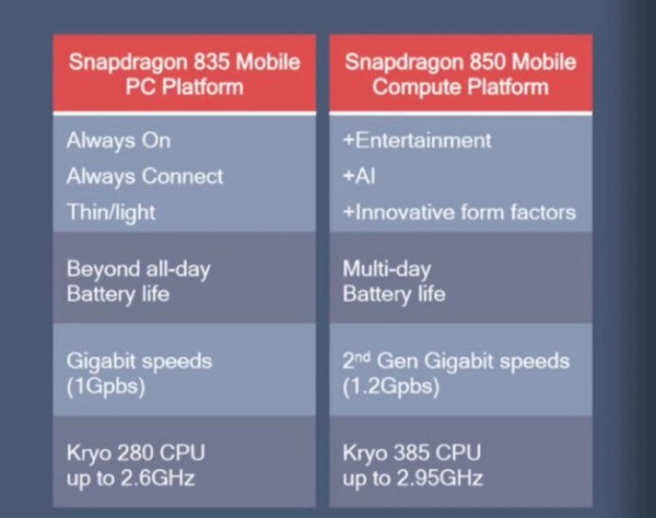 骁龙850主要基于骁龙 845移动平台,同样采用10nm工艺并集成高通的人工智能引擎AIE。不过骁龙845是为手机设计,主要用于安卓旗舰手机,骁龙850则是为Windows 10 PC而设计。两个移动平台都包含相同的8个10nm Kryo 385内核,但骁龙850的主频可达2.96GHz,而不是2.8GHz。