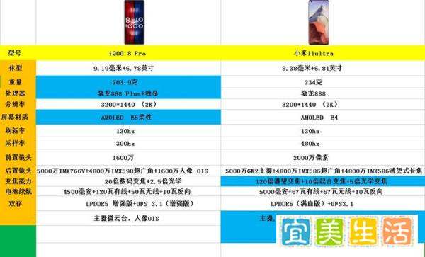 一加 9 Pro:采用骁龙888处理器,性能略逊于骁龙888 Plus,且无独立显示芯片。日常使用流畅,但在高负载游戏场景中可能因散热压力导致帧率波动。屏幕iQOO 8 Pro:首发三星E5材质屏幕,峰值亮度1500尼特,触控采样率300赫兹,支持2K分辨率与120赫兹刷新率。采用COP封装工艺,下巴更窄,屏占比更高;超声波3D广域指纹识别区域大、解锁速度快,且支持湿手解锁。一加 9 Pro:使用三星E4材质屏幕,峰值亮度1300尼特,触控采样率240赫兹,同样支持2K分辨率与120赫兹刷新率。屏幕显示效果优秀,但E5材质在功耗与亮度上更具优势。充电iQOO 8 Pro:有线充电功率达120瓦,18分钟即可充满4500毫安电池;无线充电功率50瓦,充电速度处于旗舰机第一梯队。一加 9 Pro:有线充电功率65瓦,约29分钟充满4500毫安电池;无线充电功率同样为50瓦。有线充电速度明显落后于iQOO 8 Pro。拍摄iQOO 8 Pro:后置三摄组合,主摄为5000万IMX766V传感器,搭载微云台防抖技术,在运动拍摄与夜景场景中稳定性更强;超广角为4800万IMX589传感器,成像素质一般;人像镜头为1600万像素,支持OIS光学防抖。一加 9 Pro:后置四摄组合,主摄为4800万IMX789传感器(OIS光学防抖),超广角为5000万IMX766传感器,长焦镜头为800万像素(OIS光学防抖),另有200万黑白镜头辅助成像。超广角镜头素质优于iQOO 8 Pro,适合风光摄影。手感iQOO 8 Pro:机身重量203.9克,厚度9.19毫米,因内置更大散热模块与电池,手感偏厚重。一加 9 Pro:机身重量197克,厚度8.7毫米,整体更轻薄,握持感更舒适。相同点电池容量均为4500毫安,续航表现接近。屏幕刷新率同为120赫兹,日常滑动流畅。无线充电功率均为50瓦,支持反向无线充电。前置摄像头均为1600万像素,自拍效果相当。总结iQOO 8 Pro优势:性能更强(骁龙888 Plus+独显)、屏幕素质更高(E5材质+超声波指纹)、充电速度更快(120瓦有线)、主摄防抖更稳(微云台)。一加 9 Pro优势:机身更轻薄、超广角镜头素质更优。选择建议:若追求极致性能、屏幕显示与快充体验,iQOO 8 Pro是更全面的选择;若对手机重量敏感或热衷超广角摄影,一加 9 Pro可满足需求,但需接受其性能与屏幕的相对不足。