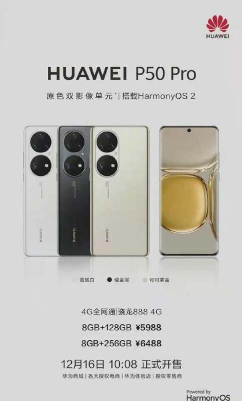 华为 P50 Pro新版本于今日正式上市,新增骁龙888 4G版本并扩展存储规格,具体售价及配置如下: