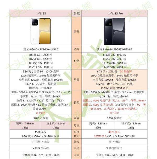 小米13和小米13 Pro作为小米今年的旗舰产品,在性能、屏幕、拍照等方面都有着出色的表现。以下是两款手机的详细参数配置对比及购买建议。