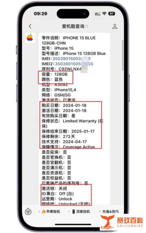 文中案例中的iPhone15通过序列号查询整机报告,确认以下关键信息: