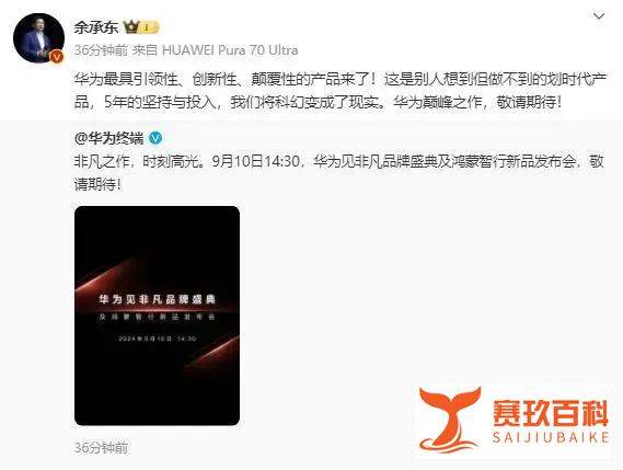 华为消费者业务CEO余承东在微博上转发并评论称:“华为最具引领性、创新性、颠覆性的产品来了!这是别人想到但做不到的划时代产品,5年的坚持与投入,我们将科幻变成了现实。华为巅峰之作,敬请期待!”此外,华为问界M9五座版本也将在同日发布。