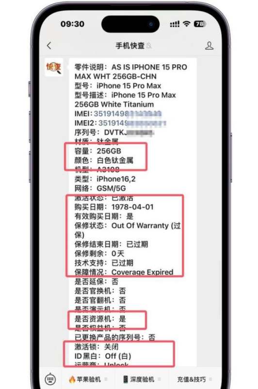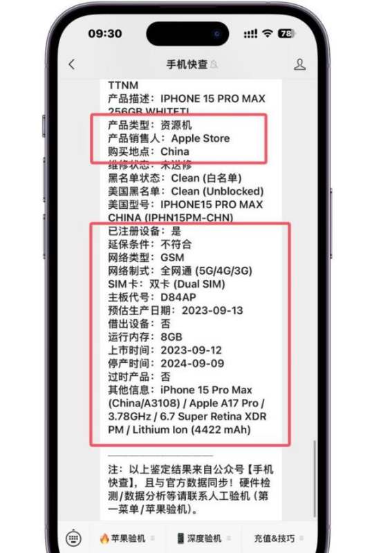 查询整机报告:通过序列号或IMEI码查询整机报告,是识别资源机的最可靠方法。整机报告中会明确显示机器的原始数据,包括购买日期、是否资源机、产品类型等。例如,某iPhone15Pro Max的整机报告显示:购买日期为1978/4/1(资源机统一日期)、无激活日期、已过保、产品类型为资源机,这些信息均表明该机为资源机,而非零售机。