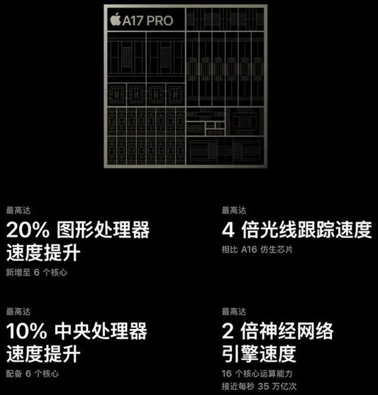A17pro芯片有190亿个晶体管,采用台积电3nm制程技术,搭载6核CPU,单线程的性能较14系列提升了10%左右,能效核心大概是之前的3倍左右,并且搭载了6核GPU,性能比14系列增强了20%左右,同时支持光线追踪。