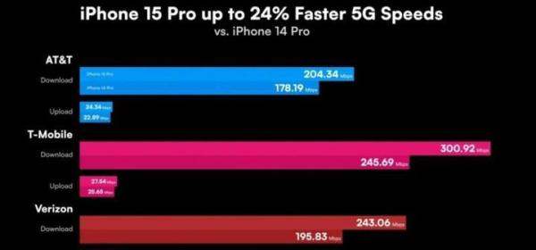 根据SpeedSmart公布的最新数据,在美国三大运营商的5G网络环境下,iPhone 15 Pro系列的5G网速比iPhone 14 Pro系列快约24%。