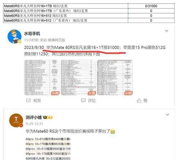 价格情况:华为Mate 60 RS非凡大师1TB版本的官方定价为12999元。然而,自发布以来,这款手机在第三方渠道的价格出现了显著溢价,目前报价已达到3.1万元。这一价格比官方定价高出1倍以上,甚至超过了iPhone 15 Pro Max顶配版的价格,因此有网友戏称其为“电子茅台”。