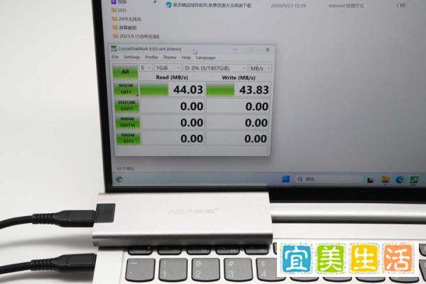 CrystalDiskMark软件实测读取速度44.03MB/s,写入速度43.83MB/s,均符合USB 2.0标准(理论速率60MB/s)。