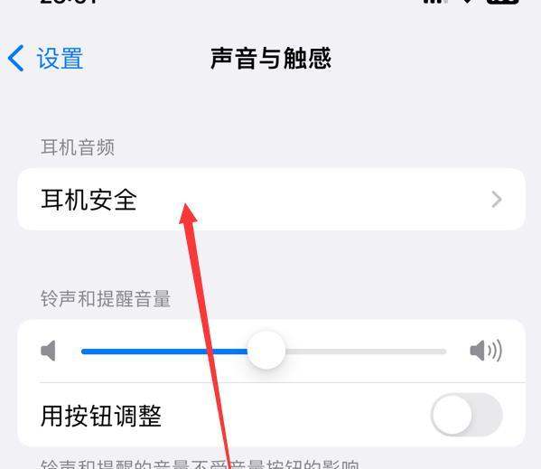 进入“耳机安全”设置在“声音与触感”页面中,向下滑动找到耳机安全选项并点击进入。该功能专为保护听力设计,可管理耳机音量及高音量限制。