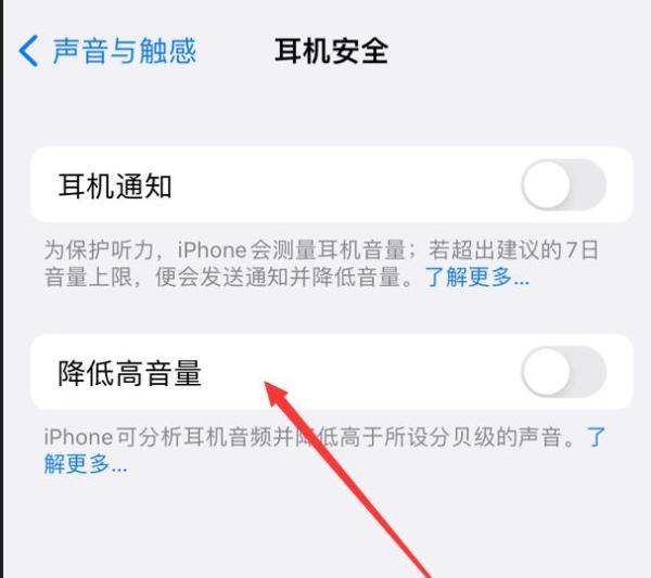开启“降低高音量”功能在“耳机安全”页面中,找到降低高音量选项,点击右侧开关将其开启。开启后,系统会自动监测耳机音量,当音量超过安全阈值时,会动态降低音量以保护听力。
