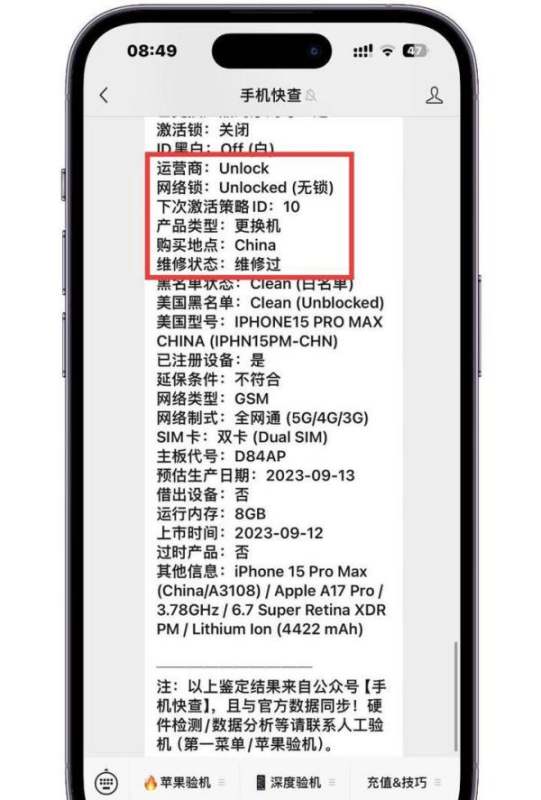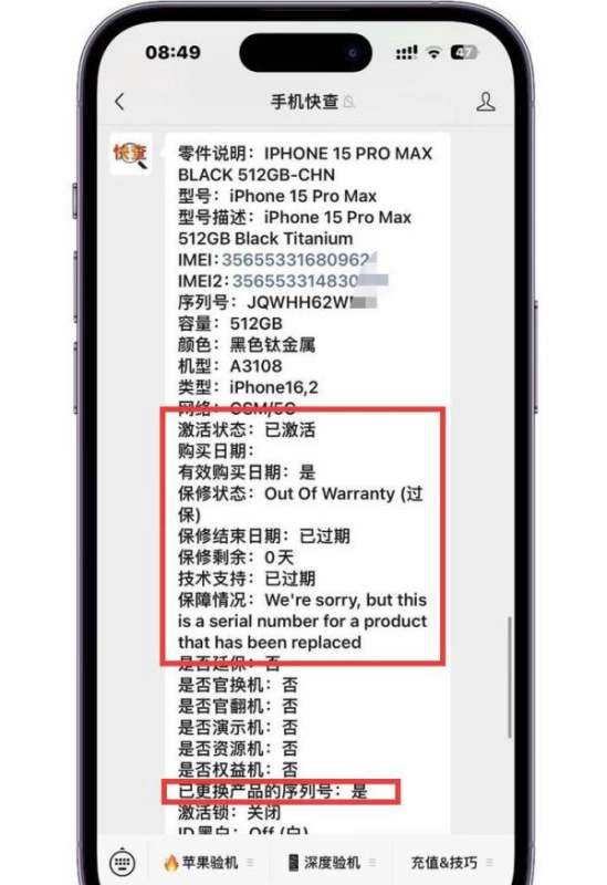 实际案例警示一台国行iPhone15Pro Max(512GB、M开头型号)被粉丝以8000多元购买,查询整机报告后发现为黑机。设备已激活但无保修日期,序列号被更换,维修记录显示为“更换机”。