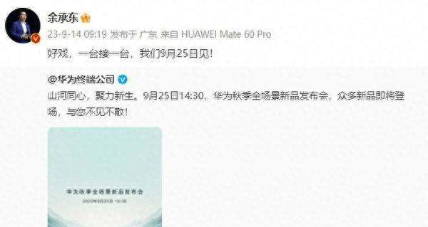 华为终端公司于9月14日正式宣布,将于9月25日14:30举办华为秋季全场景新品发布会。此次发布会不仅将展示已上架的华为Mate60系列多款新机,还可能带来全新华为旗舰平板等其他新品。余承东转发该微博并评论称:“好戏,一台接一台。”
