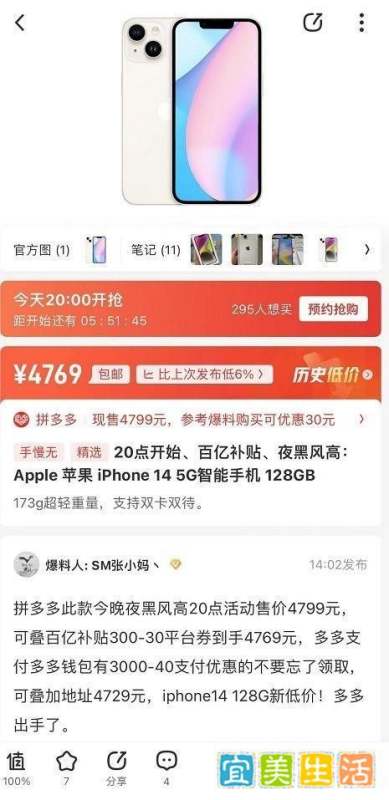 价格历史对比iPhone 14于2022年9月发布,起售价为5999元(128GB)。此次双11促销价较首发价降低1230元,创下该机型价格新低。此前最低价出现在发布后一个月的部分渠道,但优惠仅300-500元,远不及本次活动。