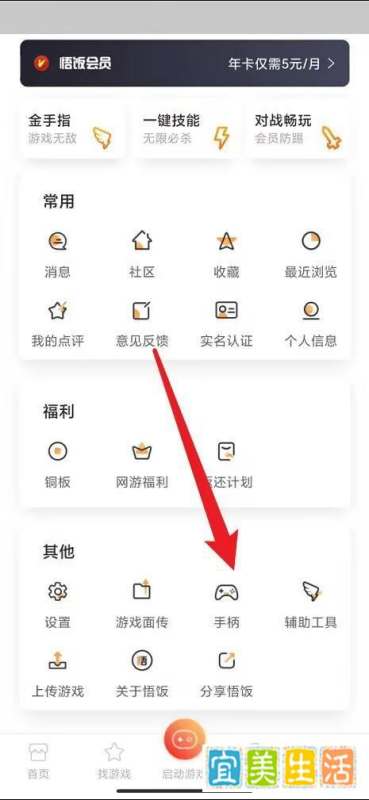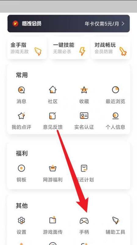 打开悟饭游戏厅后,在底部导航栏中找到并点击“我的”选项。这一步骤是进入个人设置页面,为接下来的手柄连接做准备。点击手柄功能: