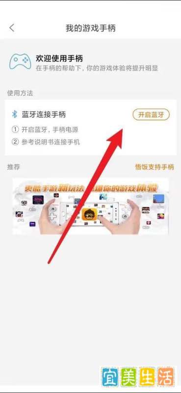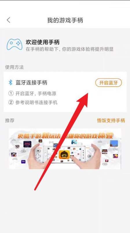 接下来,点击页面中的“开启蓝牙”选项。这将自动跳转到手机的蓝牙设置界面,或者直接在悟饭游戏厅内开启蓝牙功能(取决于应用的具体设计)。连接蓝牙手柄: