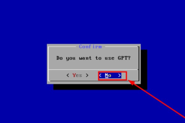 6、第六步创建完成会询问是否使用GPT分区。使用Legacy兼容引导方式,选择“No”。