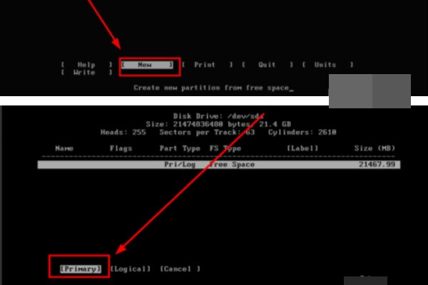 7、第七步接下来会进入到分区工具界面,左右方向键选择“New”,新建一个分区,选择“Primary”新建一个主分区。