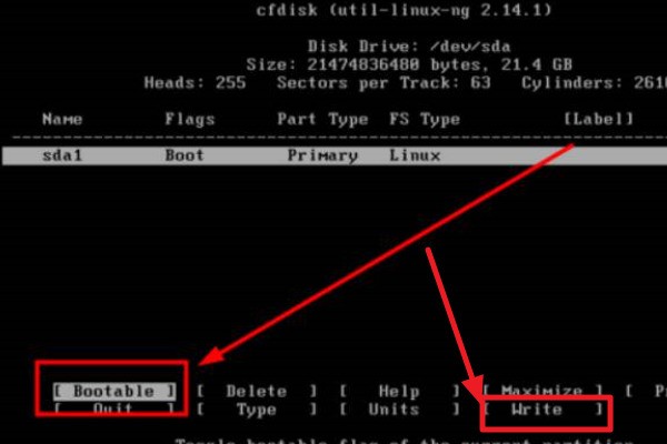 9、第九步把刚才分好的区设置为活动分区,用左右方向键选择“Bootable”和“Write”,按回车确认。