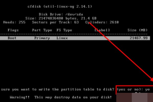 10、第十步把刚才的所有操作写入到硬盘,分区工具会提示是否确定保存,输入“yes”确认。