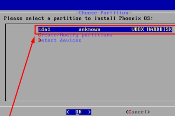 11、第十一步选择“Quit”,退出分区工具,退出后可以在分区选择列表中看到新分的sda1,选择安装Phoenix OS。