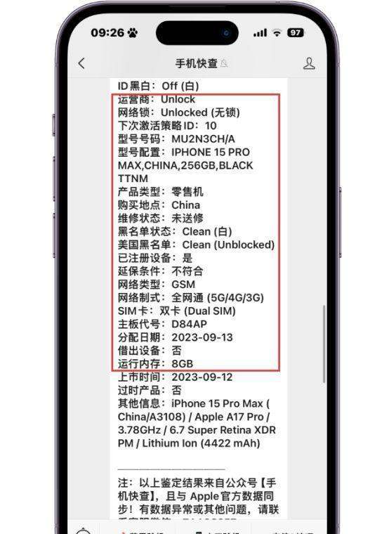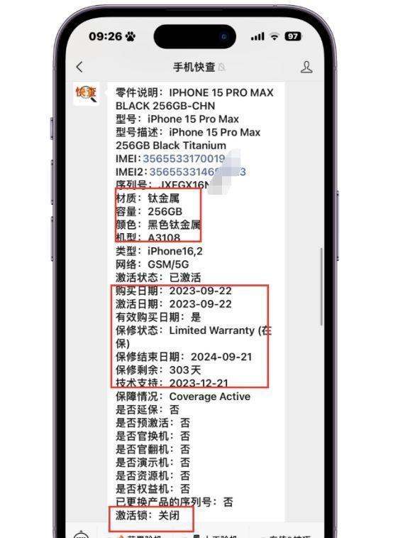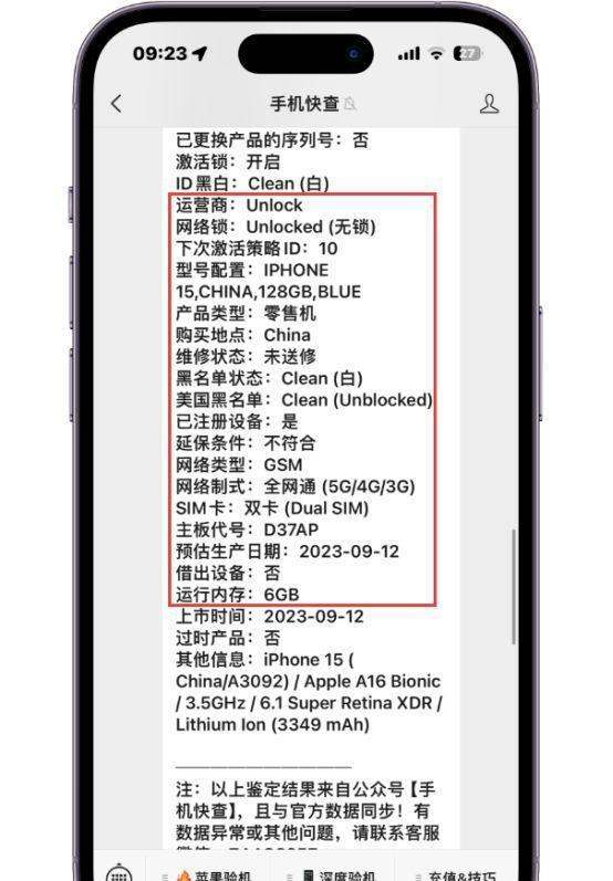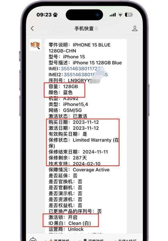 性价比与市场验证价格与成色:以粉丝入手的二手iPhone15为例,4100元的价格即可购得无拆无修、功能正常的国行128GB版本。通过序列号查询整机报告,可确认其激活日期、保修剩余天数(如287天)、无网络锁、未送修等关键数据,确保设备安全性。