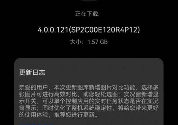 华为Mate60 Pro已推送鸿蒙OS 4.0.0.121版本更新,安装包1.57GB,变化显著,未收到的用户可等待分批推送。