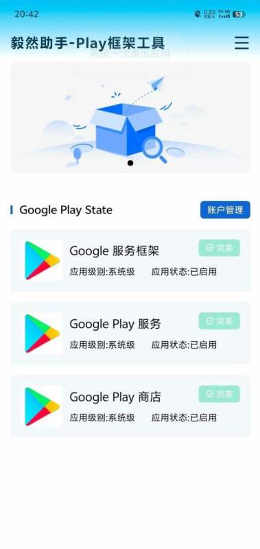 点击工具界面中的“账户管理”,若能正常加载进入,则说明设备位于谷歌支持地区,可继续安装;若无法加载,需检查网络或更换地区设置。