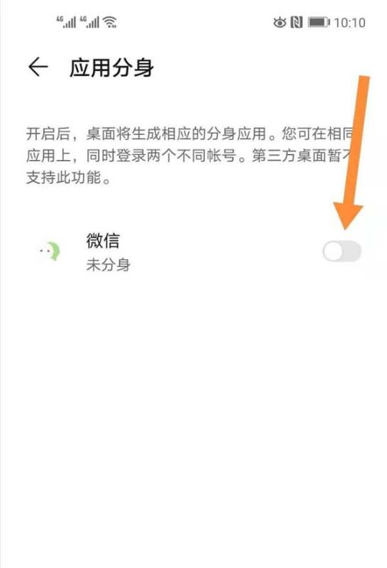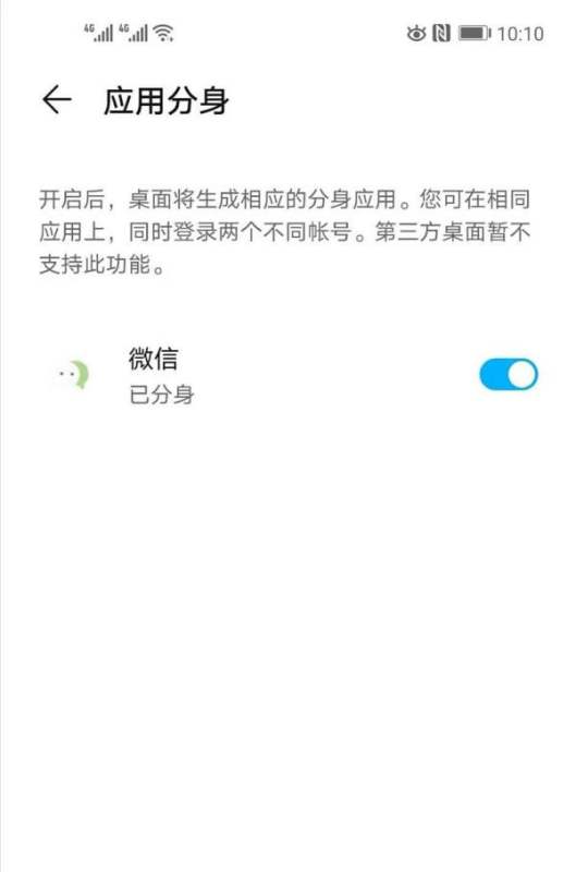 第四步:创建微信分身在应用分身列表中找到【微信】,将右侧开关向右拖动至开启状态。系统会自动创建微信分身应用,并在桌面生成第二个微信图标。