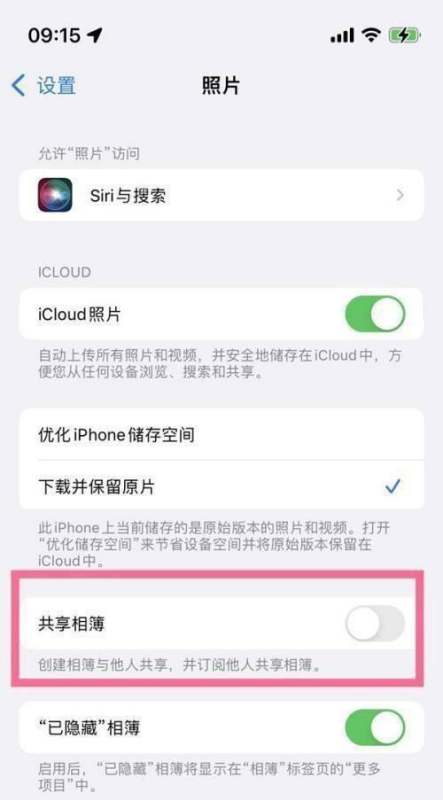 第二步:开启共享相簿在照片设置页面中,找到共享相簿功能,点击右侧的开关按钮至绿色状态(显示为开启)。