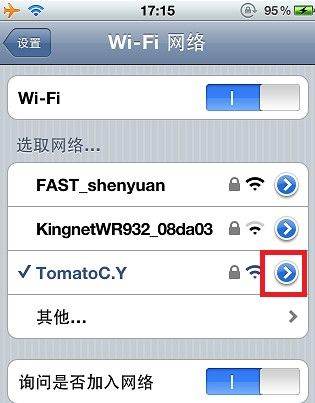 第一步:打开手机设置,选择“Wi-Fi”,然后,看到当前已经连接上的那个wifi信号,点击最右边的那个蓝色圆圈小箭头
