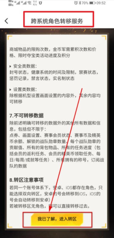 5、阅读系统角色转移服务,然后点击“我已了解,进入转区”按钮。