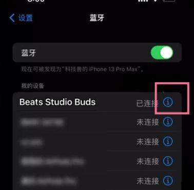 进入耳机设置:在已连接设备列表中,找到并点击Beats Studio Buds旁边的【i】图标。