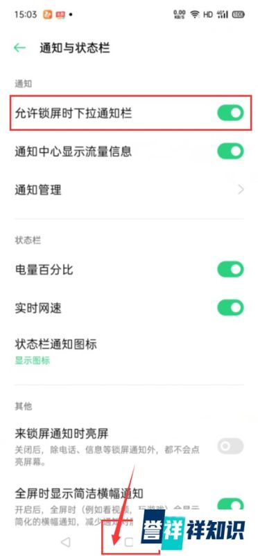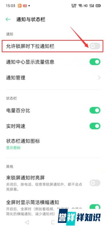 第三步:开启锁屏下拉通知栏功能在通知与状态栏页面中,找到允许锁屏时下拉通知栏选项,将其右侧的开关滑动至开启状态(显示为绿色或蓝色)。