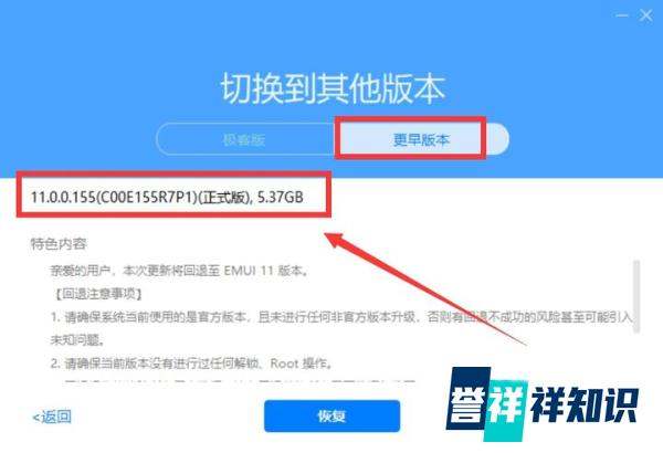 第三步:下载EMUI系统版本连接成功后,在电脑端“华为手机助手”窗口中点击“系统更新”,弹出新窗口。点击“切换到其它版本”,选择上一个EMUI系统版本(如11.0.0.155),点击“恢复”按钮开始下载。注意事项:
