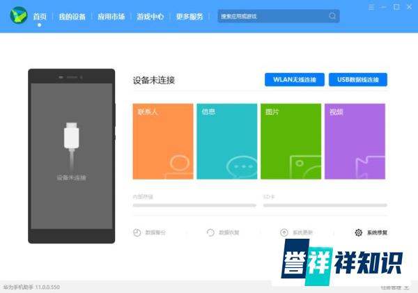 通过百度搜索“华为手机助手”,下载并安装到电脑上,安装方法与普通软件一致。打开后的软件界面如下: