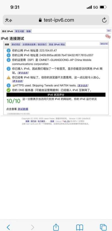 三大手机运营商(移动、联通、电信)已全面支持IPv6,4G/5G网络用户可通过浏览器搜索“IPv6 test”测试地址,例如2409开头的地址为移动IPv6公网地址。