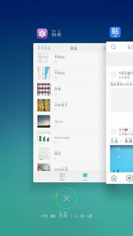 R9点击屏幕点击左侧按键,出现当前后台运行的程序,程序轻轻下拉,即可解锁,屏幕底部显示“×”就可以一键关闭后台程序拉。