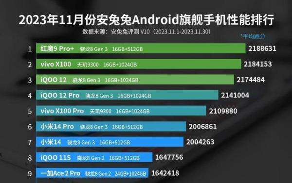 安兔兔10月安卓旗舰性能榜中,红魔9 Pro+排名第一,小米14排名第七。以下是详细排名情况: