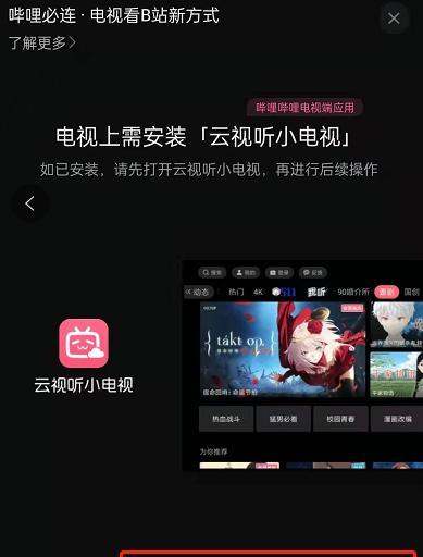 步骤3:在电视端安装云视听小电视根据手机端提示,在电视设备的应用商店(如当贝市场、沙发管家等)中搜索并安装云视听小电视(哔哩哔哩电视版应用)。安装完成后,在手机端点击“我已安装,立即体验”按钮。