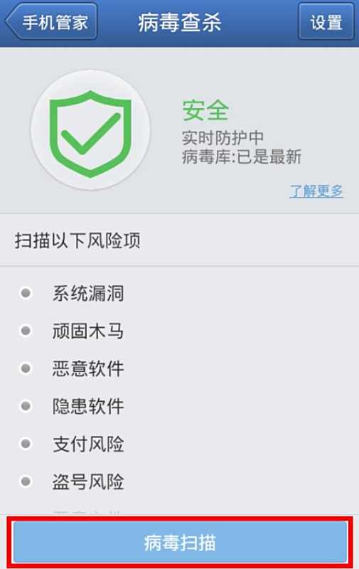 4.健康管理。国际著名杀毒测试AV-Test中,腾讯手机管家已经获得了AV-Test 2013移动杀毒认证,是国内免费移动杀毒软件中,获得专业认证的手机杀毒软件。进入管家-安全防护-病毒查杀,即可对病毒进行查杀、防御,给手机提供一个安全的运行环境。