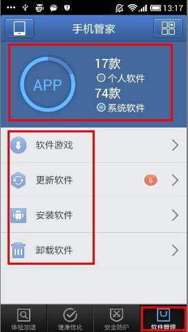 1.软件管理。打开手机管家的软件管理页面,会显示手机当前安装的个人软件和系统软件数量,底下有四大功能入口,依次是软件游戏、更新软件、安装软件和卸载软件,方便您同时管理手机上的软件。