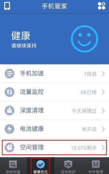 2.空间管理。进入手机管家—健康优化—最下面一项“空间管理”,即可查看剩余内存空间,对已占用内存资料进行管理,还可进行软件搬家,将软件移至SD卡减少手机内容占用,提升手机运行速度。
