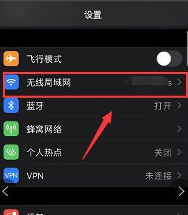 在手机设置中开启无线局域网配置,点击当前连接网络后的绿色感叹号。