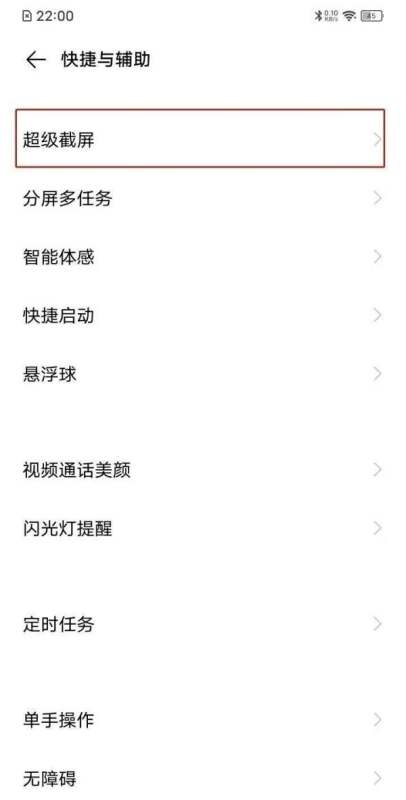 进入超级截屏设置在“快捷与辅助”页面中,选择“超级截屏”功能入口,此处可配置录屏相关的显示参数。