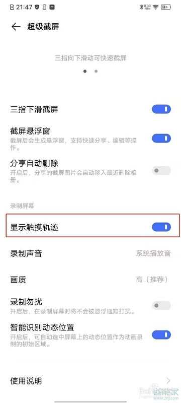 关闭显示触摸轨迹或显示触摸轮廓:在“超级截屏”界面中,找到“显示触摸轨迹”或“显示触摸轮廓”的开关选项。根据手机型号和系统版本的不同,这两个选项可能同时存在,也可能只存在其中一个。将对应的开关关闭,即可在录屏时去掉小白点。
