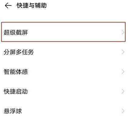 选择超级截屏:在“快捷与辅助”界面中,继续寻找并点击“超级截屏”选项。超级截屏功能不仅提供了截屏的多种方式,还包含了录屏的相关设置。
