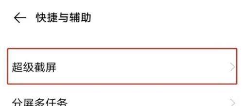 进入超级截屏设置:在“快捷与辅助”页面中,找到“超级截屏”功能并点击,进入截屏相关设置界面。