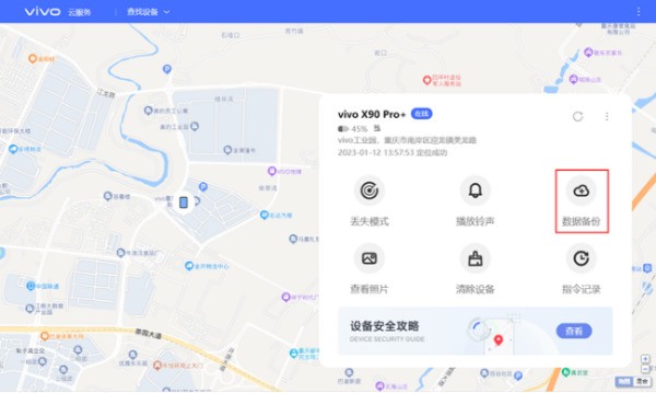 *注:操作“数据备份”后,可点击页面“指令记录”,查看设备是否执行指令,同时登录vivo云服务官网,查询数据是否备份成功。丢失设备的数据备份成功后才可以在其他设备上同步云端数据。