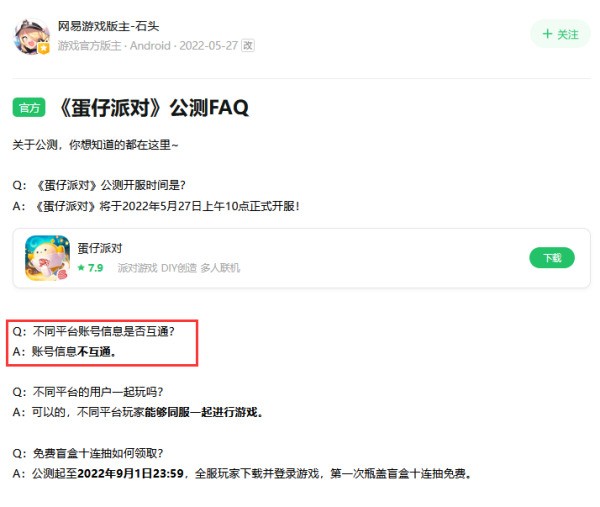 根据官方信息,蛋仔派对不同平台的账号信息不互通,即android、ios账号不能互登。但是不同平台的账号可以同服进行游戏。